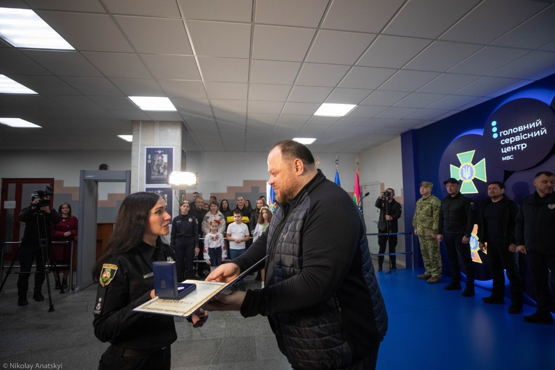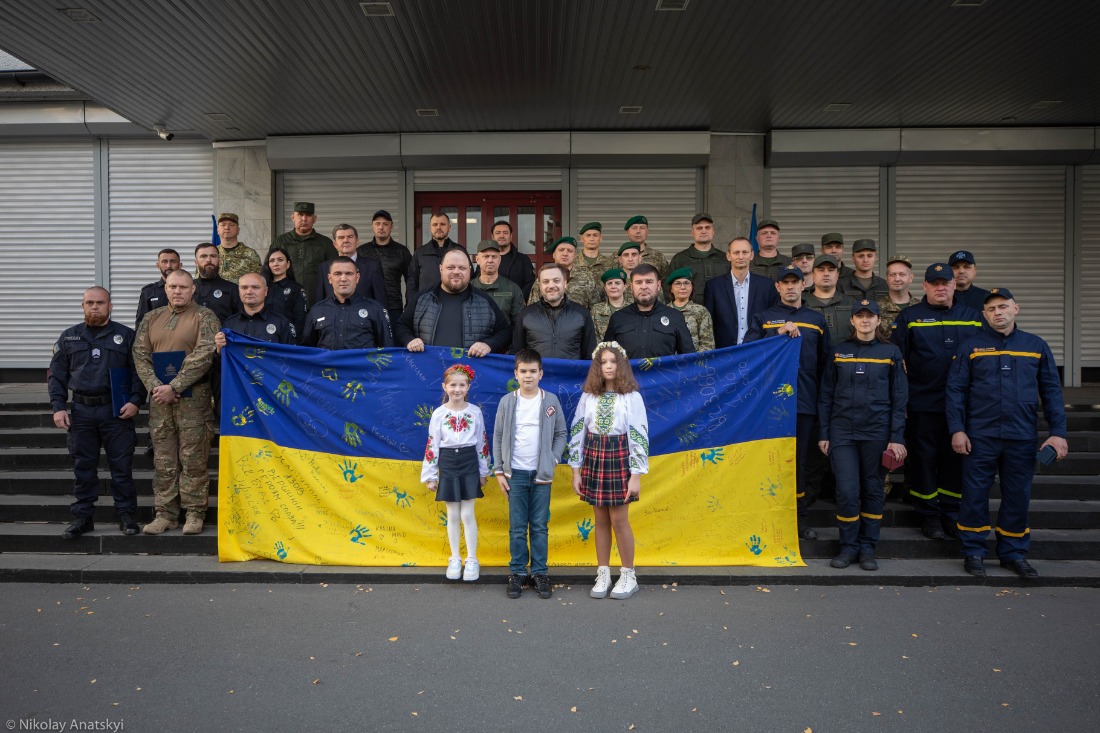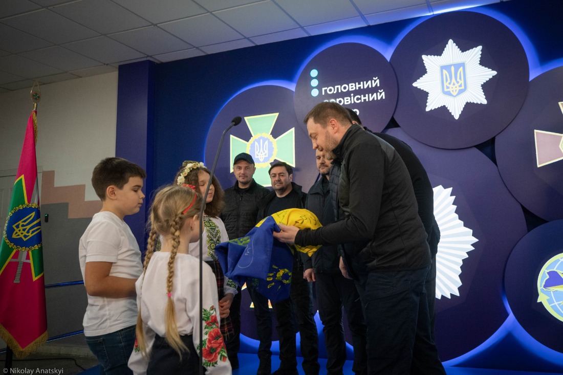 Сьогодні, під час заходів з нагоди Дня захисників і захисниць України діти поліцейських з регіонів, які постраждали від військової агресії росії, вручили прапор для бійців системи МВС, які стоять на захисті держави. Стяг передали Голові Верховної Ради України Руслану Стефанчуку та міністру внутрішніх справ Денису Монастирському. Під час заходу вони також нагородили держаними відзнаками найкращих гвардійців, прикордонників, поліцейських, рятувальників та службовців системи МВС.