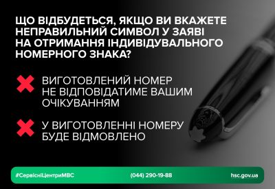 Якщо в комбінації, зазначеній у заяві, буде вказано неправильний символ, то в результаті виготовлений номер не відповідатиме вашому очікуванню і вам доведеться повторно подавати заяву, а також взагалі можлива відмова у виготовленні такого номерного знаку за технічними вимогами або некоректність в обліку.