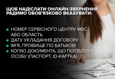 Якщо немає можливості особисто звернутись, можливо це зробити онлайн –  надіслати звернення до Регіонального сервісного центру МВС, в якому надавалась послуга. Контакти регіонального сервісного центру МВС можна побачити за посиланням на нашому сайті, ліворуч від інтерактивної карти, попередньо обравши необхідний регіон. Під час звернення обов’язково необхідно зазначити сервісний центр МВС, в якому оформлювався договір купівлі. Наявність цієї інформації заощаджує час та пришвидшує розгляд звернення й надання відповіді. Адже без неї нашим фахівцям доводиться витрачати додатковий час на з’ясування, в якому саме регіоні та сервісному центрі МВС оформлювався договір. Тож радимо обов’язково вказувати: