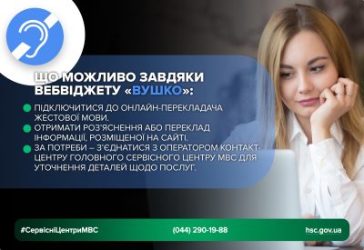 На офіційному вебсайті Головного сервісного центру МВС встановлено спеціалізований вебвіджет «Вушко», який забезпечує вільний та комфортний доступ громадян із порушеннями слуху до інформації, консультацій чи іншої допомоги онлайн – швидко, зручно та без потреби виходити з дому.