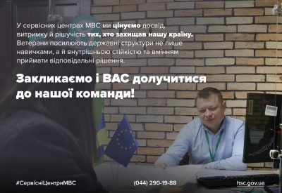 У сервісних центрах МВС ми цінуємо досвід, витримку й рішучість тих, хто захищав нашу країну. Ветерани посилюють державні структури не лише навичками, а й внутрішньою стійкістю та вмінням приймати відповідальні рішення. Закликаємо і вас долучитися до нашої команди!