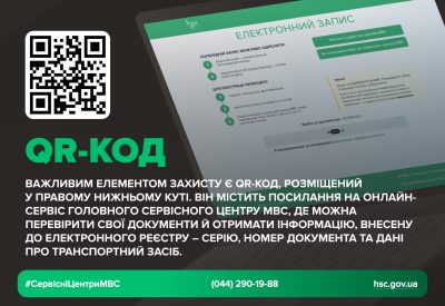 Ще одним важливим елементом захисту та справжності документа – є QR-код. Він розміщений у правому нижньому куті та містить посилання на онлайн-сервіс Головного сервісного центру МВС, де можна перевірити свої документи. Після сканування QR-коду на екрані з’являється вся інформація, внесена до електронного реєстру – серія, номер документа та дані про транспортний засіб.