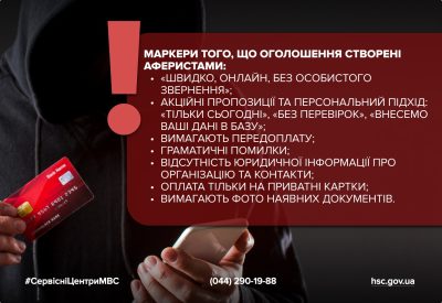 Варто пам’ятати, що адміністратори сервісних центрів МВС не ведуть листування в телефонних месенджерах. Оплата за послугу здійснюється тільки на офіційний рахунок, а не приватні картки. Офіційні сайти мають домен gov.ua. Адреса сайту Головного сервісного центру МВС — https://hsc.gov.ua.