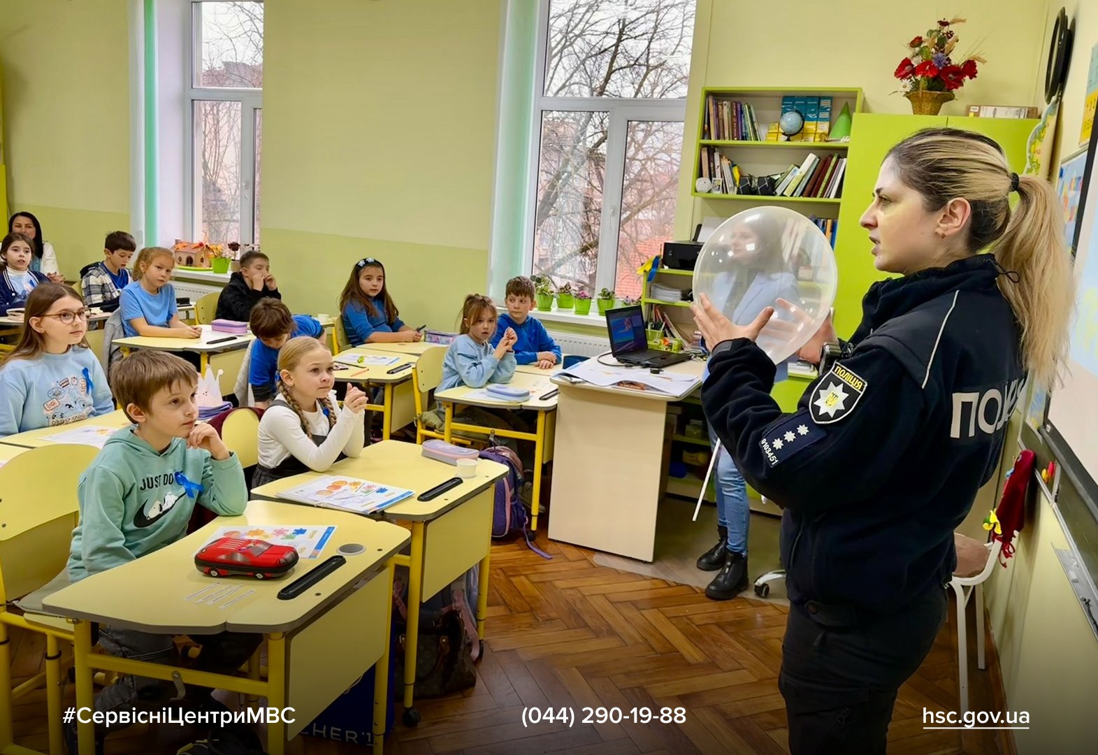У День захисту дітей працівники сервісного центру МВС Івано-Франківська спільно з патрульною поліцією взяли участь у відкритому занятті для учнів 3-Б класу ліцею №5 Івано-Франківської міської ради.