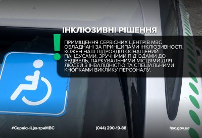 Приміщення сервісних центрів МВС обладнані за принципами інклюзивності. Кожен наш підрозділ оснащений пандусами, зручними під’їздами до будівель, паркувальними місцями для людей з інвалідністю та спеціальними кнопками виклику персоналу.