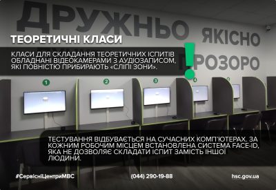 Класи для складання теоретичних іспитів обладнані відеокамерами з аудіозаписом, які повністю прибирають «сліпі зони». Тож кандидати у водії не можуть отримати можливу підказку від сторонніх осіб та виключається будь-яке втручання в іспити. Тестування відбувається на сучасних комп’ютерах. За кожним робочим місцем встановлена система Face-ID, яка не дозволяє складати іспит замість іншої людини.