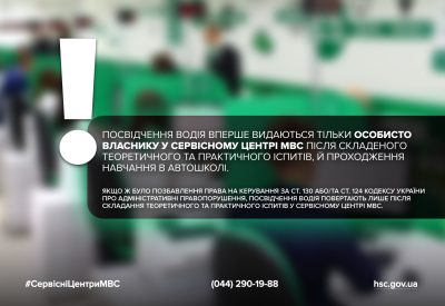Посвідчення водія вперше видаються тільки особисто власнику у сервісному центрі МВС після складеного теоретичного та практичного іспитів, й проходження навчання в автошколі. Якщо ж було позбавлення права на керування за ст. 130 або/та ст. 124 Кодексу України про адміністративні правопорушення, посвідчення водія повертають лише після складання теоретичного та практичного іспитів у сервісному центрі МВС. Якщо ж водійське видане на 2 роки, документ не повертається, у такому випадку необхідно повторно проходити навчання в автошколі та екзамеанцію в сервісному центрі МВС.