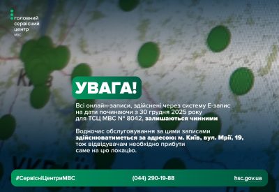 Звертаємо увагу, що всі онлайн-записи, здійснені через систему Е-запис на дати починаючи з 30 грудня 2025 року для ТСЦ МВС № 8042, залишаються чинними. Водночас обслуговування за цими записами здійснюватиметься за адресою: м. Київ, вул. Мрії, 19, тож відвідувачам необхідно прибути саме на цю локацію.