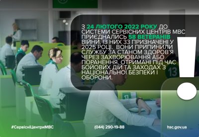 З початку повномасштабного вторгнення, 24 лютого 2022 року, до системи сервісних центрів МВС приєднались 58 ветеранів війни, які припинили військову службу за станом здоров’я внаслідок захворювань або поранень, отриманих під час участі в бойових діях та заходів з національної безпеки і оборони. Із них 33 ветерани, а це 57% від загальної кількості, були призначені у 2025 році. Серед них – захисники, які брали участь у бойових діях, отримали поранення, мають ампутації, але головне – не зламались та не здалися.