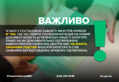 Крім того, згідно з постановою Кабінету Міністрів України № 340, під час обміну посвідчення водія на новий документ можуть бути внесені лише ті категорії, право на які документально підтверджене. Адміністратори сервісних центрів МВС не мають законних підстав вносити категорії зі слів заявника без відповідних підтверджувальних документів.