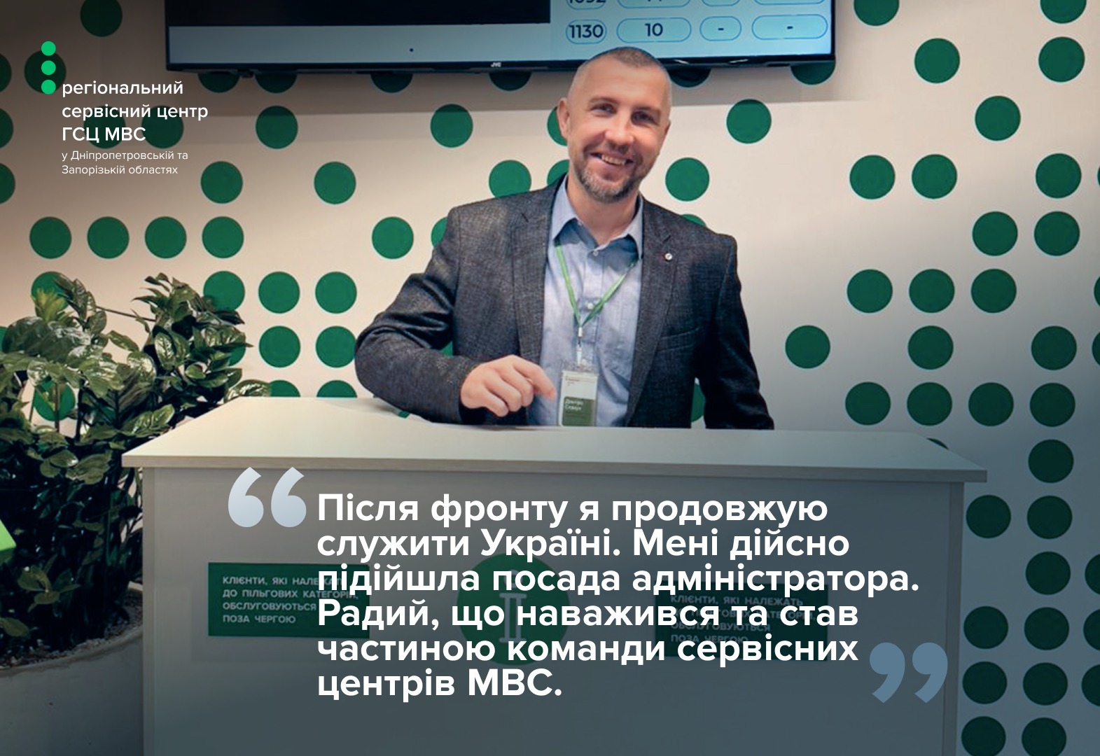 «Після фронту я продовжую служити Україні. Мені дійсно підійшла посада адміністратора. Радий, що наважився та став частиною команди сервісних центрів МВС», – поділився Дмитро.