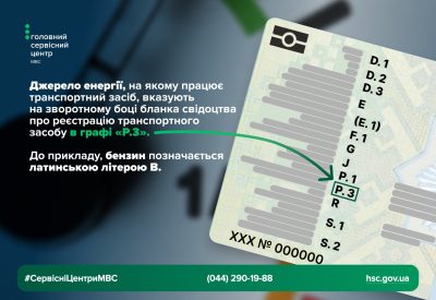 Джерело енергії, на якому працює транспортний засіб розміщуються на зворотному боці бланка свідоцтва про реєстрацію транспортного засобу в графі «P.3». До прикладу, бензин позначається латинською літерою – B.
