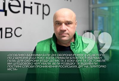 «Особливо важкими були дні оборони Ірпеня: з 25 лютого по 2 березня 2022 року, коли тримали блокпост «Караван Гала» для охорони в’їзду до міста з боку Бучі та Гостомеля. Ми цілодобово чергували, вели розвідку та відбивали постійні спроби проникнення російських ДРГ на територію міста», – пригадує захисник.