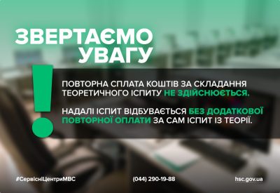 Звертаємо увагу: повторна сплата коштів за складання теоретичного іспиту не здійснюється. Надалі іспит відбувається без додаткової повторної оплати за сам іспит із теорії.