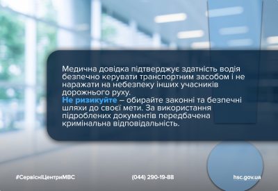 Нагадуємо: медична довідка підтверджує здатність водія безпечно керувати транспортним засобом і не наражати на небезпеку інших учасників дорожнього руху. Не ризикуйте – обирайте законні та безпечні шляхи до своєї мети. За використання підроблених документів передбачена кримінальна відповідальність.