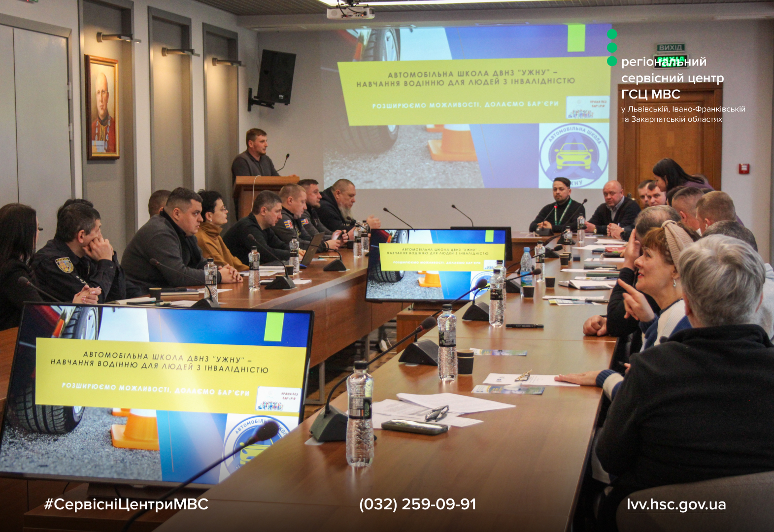 Сервісні центри МВС Львівської, Івано-Франківської та Закарпатської областей разом із фахівцями «Безбар’єрної автошколи», яка діє на базі Львівського державного університету внутрішніх справ, і представниками автошколи Ужгородського національного університету долучилися до обговорення практичних аспектів навчання осіб з інвалідністю керуванню транспортними засобами.