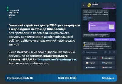 Якщо помітили в мережі підозрілі шахрайські ресурси, за допомогою волонтерського проєкту «BRAMA» (https://t.me/stopdrugsbot) його можливо заблокувати.