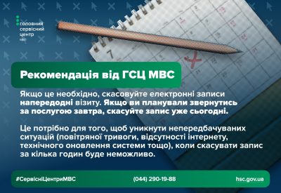 Рекомендуємо скасовувати електронні записи напередодні візиту. Тобто, якщо планували звернутись завтра за послугою, скасуйте запис сьогодні. Адже потенційно можуть виникнути непередбачені ситуації, коли за кілька годин це не вдасться зробити, наприклад: повітряна тривога, відсутність інтернету, технічне оновлення системи тощо.
