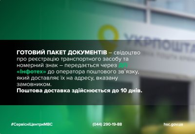 Готовий пакет документів – свідоцтво про реєстрацію транспортного засобу та номерний знак – передається через ДП «Інфотех» до оператора поштового зв’язку, який доставляє їх на адресу, вказану замовником. Поштова доставка здійснюється до 10 днів.