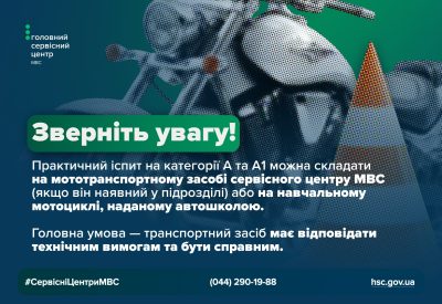 Раніше ми писали, що практичний іспит на категорії А та А1 складається лише в шоломі. З деталями цієї інформації можна ознайомитись в новині за посиланням.