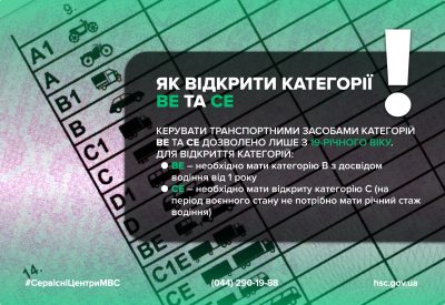 Керувати транспортними засобами категорій ВЕ та СЕ дозволено лише з 19-річного віку. Для відкриття категорій: