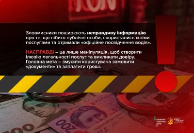 Зловмисники поширюють неправдиву інформацію про те, що нібито публічні особи, скористались їхніми послугами та отримали «офіційне посвідчення водія». Насправді – це лише маніпуляція, щоб створити ілюзію легальності послуг та викликати довіру. Головна мета – змусити користувача замовити «документи» та заплатити гроші.