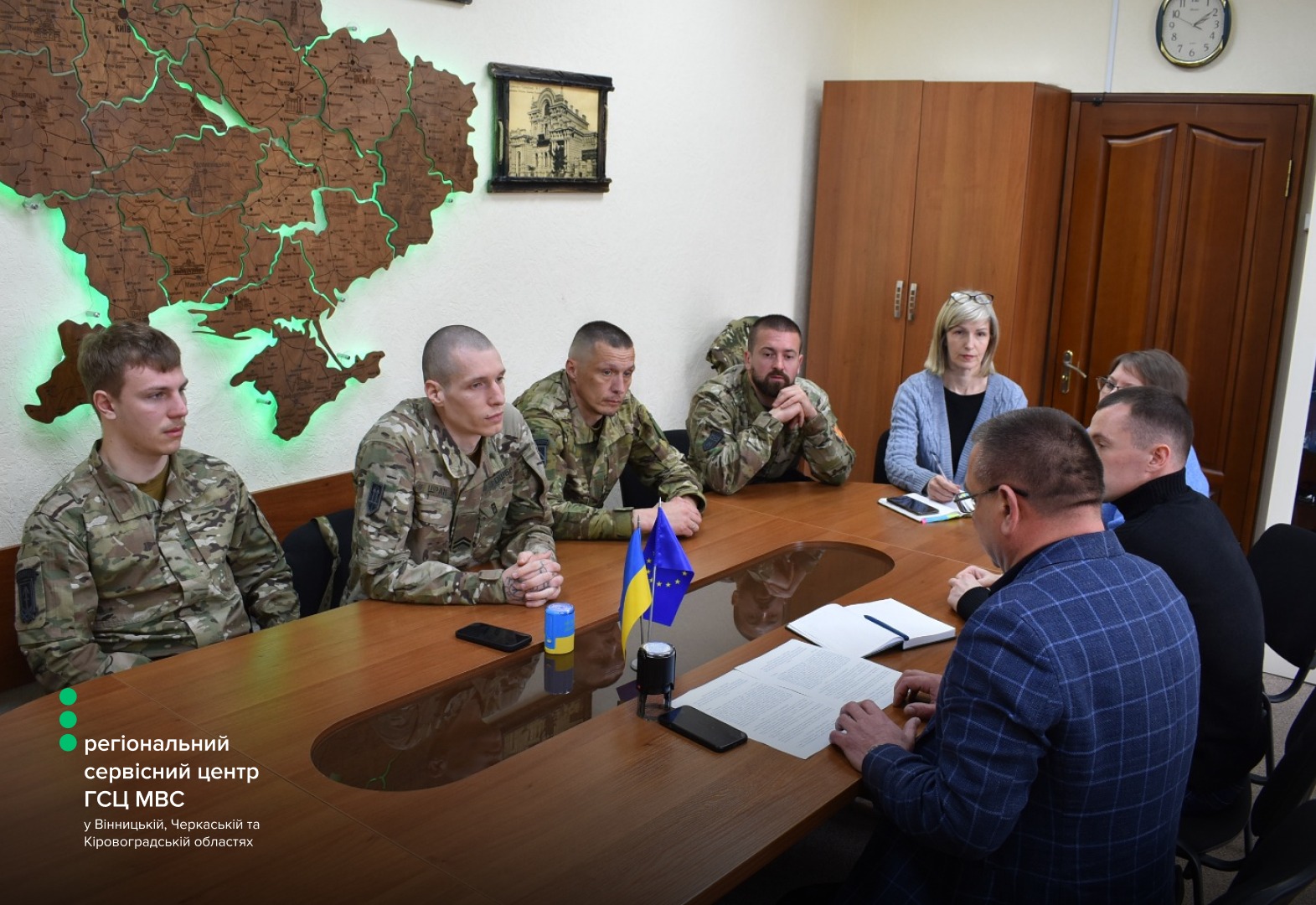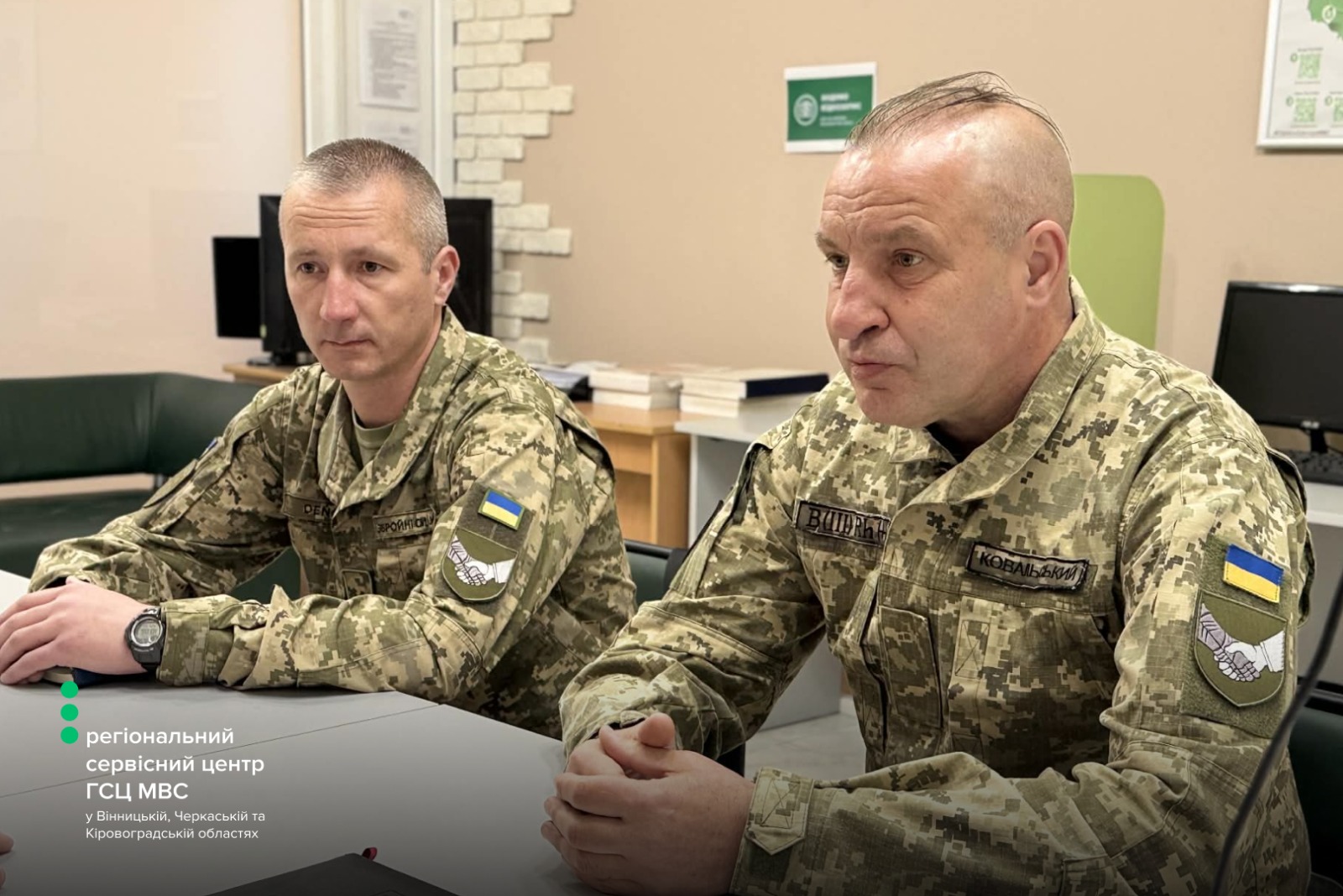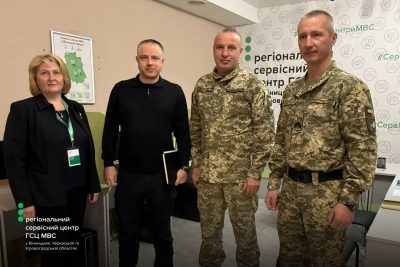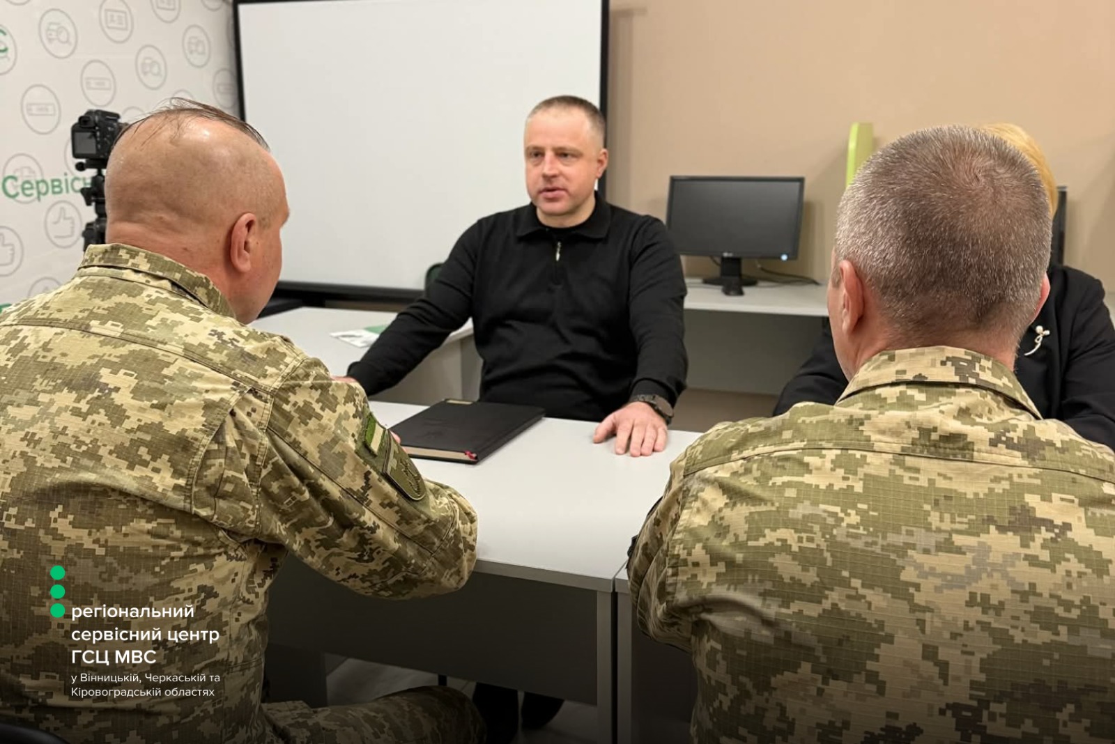 Керівництво регіонального сервісного центру МВС провело робочу зустріч із представниками Вінницької бригади територіальної оборони. До обговорення долучилися офіцер відділу цивільно-військового співробітництва Денис Русавський, фахівець патронатної служби ЦВС, старший солдат Роман Ковальський, начальник регіонального сервісного центру МВС у Вінницькій, Черкаській та Кіровоградській областях Сергій Гайду.