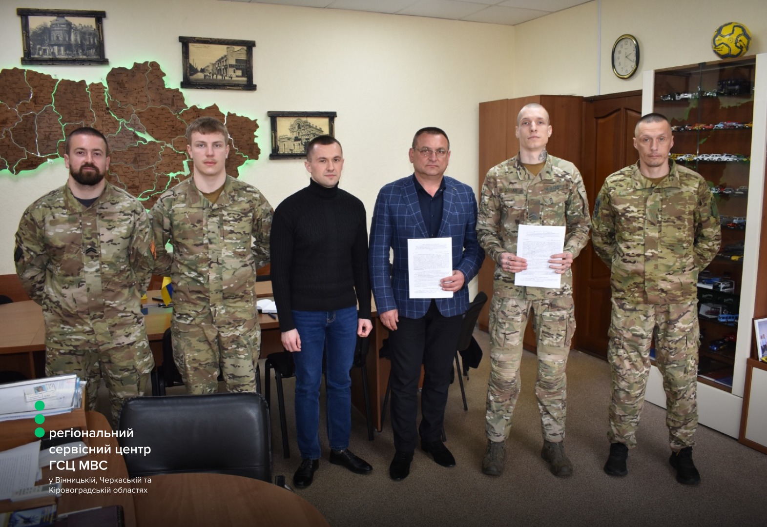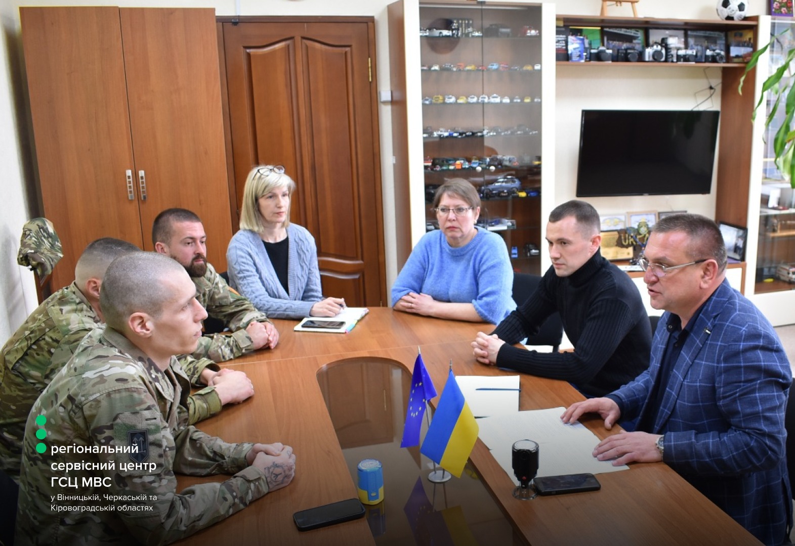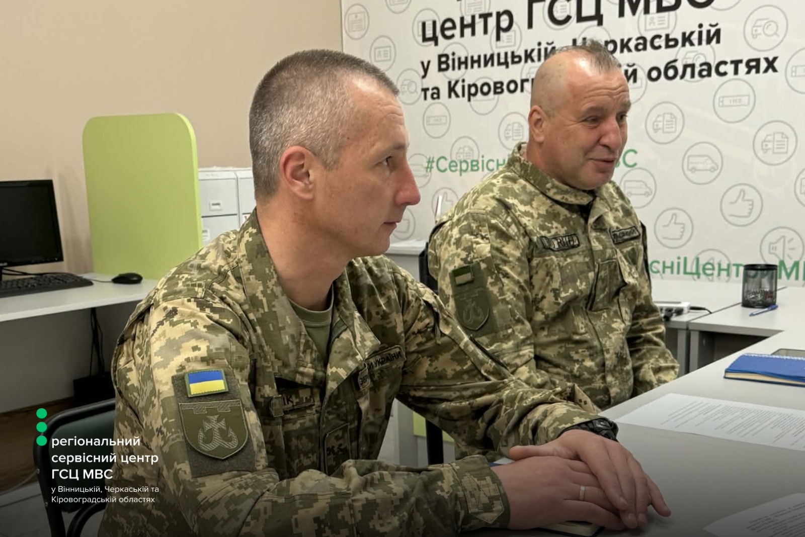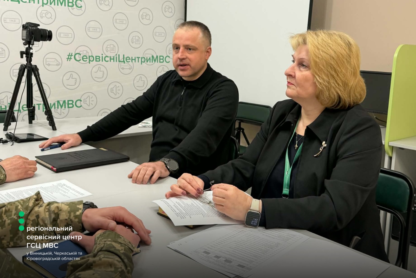 Керівництво регіонального сервісного центру МВС провело робочу зустріч із представниками Вінницької бригади територіальної оборони. До обговорення долучилися офіцер відділу цивільно-військового співробітництва Денис Русавський, фахівець патронатної служби ЦВС, старший солдат Роман Ковальський, начальник регіонального сервісного центру МВС у Вінницькій, Черкаській та Кіровоградській областях Сергій Гайду.