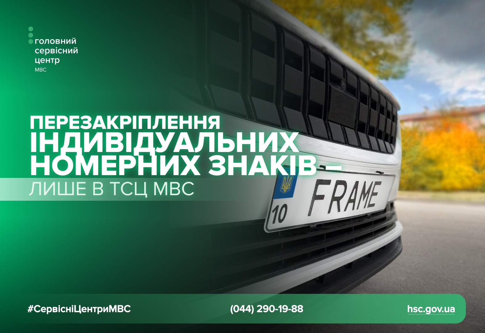 Індивідуальні номерні знаки – це спосіб персоналізувати транспортний засіб, підкреслити його унікальність або створити впізнаваний напис.  У деяких випадках власникам необхідно перезакріпити такий знак – передати його іншій особі або прив’язати до іншого автомобіля. Оскільки це пов’язане зі зміною офіційних реєстраційних даних, перезакріплення здійснюється виключно особисто у територіальному сервісному центрі МВС. Що таке перезакріплення ІНЗ? Перезакріплення індивідуального номерного знака (ІНЗ) – це процедура передачі вже виготовленого та закріпленого за особою номерного знака іншому транспортному засобу або новому власнику. Тому процедура оформлення здійснюється особисто або за нотаріально завіреним дорученням лише у ТСЦ МВС шляхом подання відповідної заяви. Після розгляду питання про перезакріплення в ТСЦ МВС проводиться перереєстрація транспортного засобу, і заявник отримує нове свідоцтво про реєстрацію з відміткою про ІНЗ. Потрібні документи: свідоцтво про реєстрацію транспортного засобу; документ, що посвідчує особу; якщо передається ІНЗ іншій особі – письмова згода власника ІНЗ (в окремих випадках засвідчена нотаріально). З повним переліком документів можна ознайомитись на сайті Головного сервісного центру МВС. Як скористатися послугою? Щоб перезакріпити індивідуальний номерний знак, підготуйте необхідні документи та зверніться до будь-якого зручного територіального сервісного центру МВС. Для комфорту ви можете попередньо обрати час візиту за допомогою сервісу Е-запис. У ТСЦ МВС адміністратори допоможуть оформити заяву на перезакріплення ІНЗ та перевірять подані документи. Після перевірки документів індивідуальний номерний знак буде офіційно прив’язаний до нового транспортного засобу або нового власника, а сам транспортний засіб – перереєстрований. Завершальним етапом є отримання нового свідоцтва про реєстрацію транспортного засобу. У документі, разом з державним номерним знаком буде зазначено індивідуальний номерний знак. Важливо! Використання ІНЗ, не закріпленого офіційно за транспортним засобом, може призвести до адміністративної відповідальності. Індивідуальні номерні знаки мають відповідати регіону, в якому зареєстровано транспортний засіб.  Рекомендується попередньо перевірити графік роботи ТСЦ та завчасно скористатися Е-записом, щоб обрати зручний час відвідування. Консультацію щодо послуг сервісних центрів МВС можна отримати за телефоном (044) 290-19-88 або на сторінках Головного сервісного центру МВС в Фейсбук та Інстаграм. Відповіді на найпоширеніші питання та корисну інформацію черпайте на сайті.