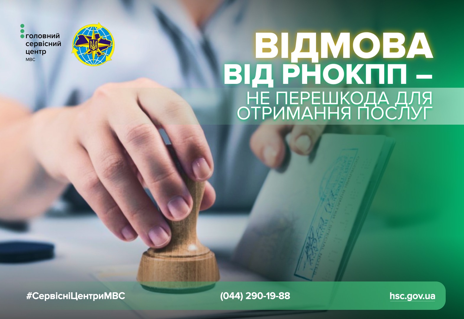 До сервісних центрів МВС звертаються громадяни, які не мають присвоєного реєстраційного номера облікової картки платника податків (РНОКПП). Це особи, які свідомо відмовилися від його отримання. Найчастішою причиною можуть бути релігійні переконання. Тому виникають запитання, чи можливо отримати послуги. Відповідно до підпункту 15 пункту 7 статті 21 Закону України «Про Єдиний державний демографічний реєстр та документи, що підтверджують громадянство України, посвідчують особу чи її спеціальний статус», у паспорті громадян, які відмовилися від отримання РНОКПП, робиться відмітка «відмова» або додається відповідне повідомлення про відмову від прийняття РНОКПП. Якщо громадянин має паспорт старого зразка (у формі книжечки), відповідна відмітка «відмова» проставляється на одній із сторінок документа. У разі, якщо особа є власником ID-картки, у графі РНОКПП (реєстраційний номер облікової картки платника податків) код не зазначається, а позначка «відмова» міститься у витягу, який надається разом із документом. У таких випадках відсутність РНОКПП не є перешкодою для отримання послуг у сервісних центрах МВС. Якщо громадянин має офіційне повідомлення про відмову, він може звернутися до сервісного центру МВС особисто, пред’явивши паспорт із відповідною відміткою. Як отримати послугу Якщо громадянин може підтвердити свою особу в електронному вигляді (наприклад, за допомогою електронного підпису, ID-картки чи застосунку «Дія»), він може записатися онлайн через електронні сервіси МВС. Якщо електронна ідентифікація неможлива, запис здійснюється безпосередньо у сервісному центрі МВС через адміністратора, що постійно чергує за інформаційною стійкою.  Звертаємо увагу, що під час першого звернення до сервісного центру МВС без РНОКПП час надання послуги може бути трохи довшим, ніж зазвичай. Важливо знати Відсутність РНОКПП не обмежує право громадянина отримувати послуги в сервісних центрах МВС. Під час кожного наступного звернення громадянин, який офіційно відмовився від РНОКПП, також може звертатися особисто через адміністратора, пред’явивши паспорт із відповідною відміткою про відмову. Отже, відсутність РНОКПП – не перешкода для отримання послуг у сервісних центрах МВС. Наші адміністратори допоможуть та забезпечать належне надання послуги. Консультацію щодо послуг сервісних центрів МВС можна отримати за телефоном (044) 290-19-88 або на сторінках Головного сервісного центру МВС в Фейсбук та Інстаграм. Відповіді на найпоширеніші питання та корисну інформацію черпайте на сайті.