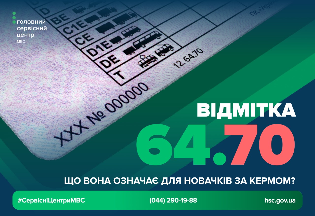 Громадяни, які отримують своє перше посвідчення водія, яке видається терміном на два роки, звертаються із запитанням: що означає відмітка 64.70 в документі? Ця позначка може викликати здивування, адже не всі розуміють, на що вона впливає і чи не обмежує вона права водія. Сервісні центри МВС пояснюють: йдеться про чинну практику, яка застосовується в Україні вже кілька років. Що означає відмітка 64.70? Відмітка 64.70 зазначається в графі 12 посвідчення водія і складається з двох частин: 64 – це код, який, відповідно до додатку до Постанови Кабінету Міністрів України № 340 від 8 травня 1993 року, означає обмеження максимальної швидкості руху для водія.  70 – позначає, саме максимально допустиму швидкість для водіїв-початківців, яка становить не більше 70 км/год. Таким чином, цей код офіційно фіксує в документі, що водій має стаж керування менше двох років і зобов’язаний дотримуватися обмеження швидкості до 70 км/год, відповідно до пункту 12.4 Правил дорожнього руху України. Чому ця відмітка важлива? Мета позначки – це не встановити нове правило, а наочно відображати вже чинне обмеження у водійському документі. Відмітка також є частиною гармонізації українських посвідчень водія з європейськими стандартами. Завдяки цій позначці: підвищується безпека на дорогах; правоохоронці відразу бачать, що водій – початківець; підтримується європейський формат посвідчень; водій не забуває про обмеження швидкості. Позначка 64.70 вноситься автоматично при оформленні першого посвідчення водія після складання іспитів в сервісних центрах МВС. Жодних додаткових документів або заяв від громадянина не потрібно. Вона не обмежує права на керування транспортним засобом, але вказує на наявність законодавчо встановленого обмеження швидкості – до моменту, поки водій не матиме два роки стажу. Після цього обмеження втрачає актуальність, однак сама відмітка в документі залишається. Позбутися цієї позначки можна лише обмінявши посвідчення водія в сервісному центрі МВС після закінчення двох років водійського стажу. Після обміну водійське посвідчення буде без цієї відмітки, і обмеження швидкості для нього знімуть. Сервісні центри МВС нагадують: правила дорожнього руху обов’язкові для всіх, а особливо важливо їх дотримуватись на початку водійського шляху. Будьте уважні, відповідальні та обізнані – і нехай кожна ваша поїздка буде безпечною! Консультацію щодо послуг сервісних центрів МВС можна отримати за телефоном (044) 290-19-88 або на сторінках Головного сервісного центру МВС в Фейсбук та Інстаграм. Відповіді на найпоширеніші питання та корисну інформацію черпайте на сайті.