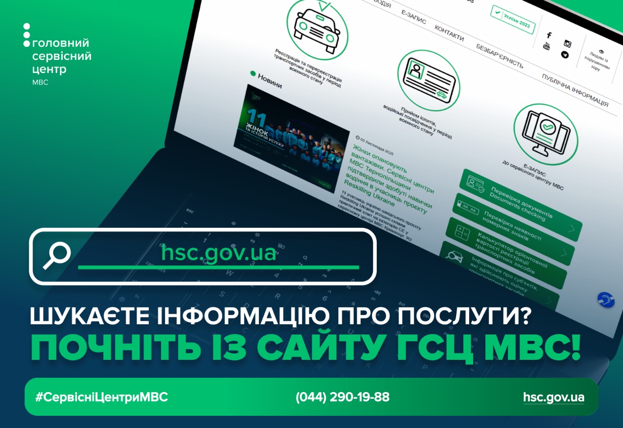 Найшвидший спосіб отримати актуальну інформацію про послуги сервісних центрів МВС - зайти на наш офіційний вебсайт. Він доступний для перегляду з будь-якого гаджета та час доби, а також найголовніше – зручний у користуванні.  Проте, часто замість того, аби самостійно ознайомитись з необхідною інформацією, користувачі шукають для цього інші шляхи. Приміром: телефонують до контакт-центру, звертаються до знайомих, надсилають повідомлення та коментарі у соціальних мережах. Але найшвидший спосіб ознайомитись із загальною інформацією про послуги, графік роботи сервісних центрів МВС, чи які документи необхідно взяти з собою, щоб обміняти посвідчення водія, доступна на нашому сайті у кілька кліків. Тож аби заощадити власний час і зробити процес максимально зручним, ми нагадуємо: найшвидший спосіб знайти відповідь – офіційний сайт Головного сервісного центру МВС. На сайті ГСЦ МВС можете: отримати актуальну інформацію про всі послуги – реєстрація/перереєстрація транспортних засобів, обмін/відновлення посвідчення водія, перевезення небезпечних вантажів, виготовлення та зберігання номерних знаків, погодження конструкцій транспортних засобів тощо; дізнатися повний перелік документів, необхідних для отримання конкретної послуги; перевірити графік роботи, контакти та адреси територіальних і регіональних сервісних центрів МВС; записатися до територіального сервісного підрозділу через систему «Е-запис»; скористатися електронними сервісами, що дозволяють виконати частину дій без візиту до підрозділу – перевірка документів, наявності номерних знаків і калькулятор орієнтовної вартості реєстрації транспортних засобів. Окрему увагу варто звернути на розділ «Новини», де ми регулярно публікуємо важливі оновлення, зміни в роботі сервісних центрів МВС і корисні роз’яснення. Також радимо переглянути розділ «Часті питання» – там зібрані відповіді на найактуальніші ситуації, з якими стикаються громадяни. Часто необхідна інформація вже є там, у зручному та зрозумілому форматі. А якщо після ознайомлення з інформацією залишилися запитання – ми завжди поруч. Зателефонуйте до нашого контакт-центру ГСЦ МВС: (044) 290-19-88 Наші фахівці допоможуть знайти рішення у будь-якій ситуації. Головний сервісний центр МВС – прозорі правила, чіткі інструкції та підтримка для кожного. Консультацію щодо послуг сервісних центрів МВС можна отримати за телефоном (044) 290-19-88 або на сторінках Головного сервісного центру МВС в Фейсбук та Інстаграм. Відповіді на найпоширеніші питання та корисну інформацію черпайте на сайті.