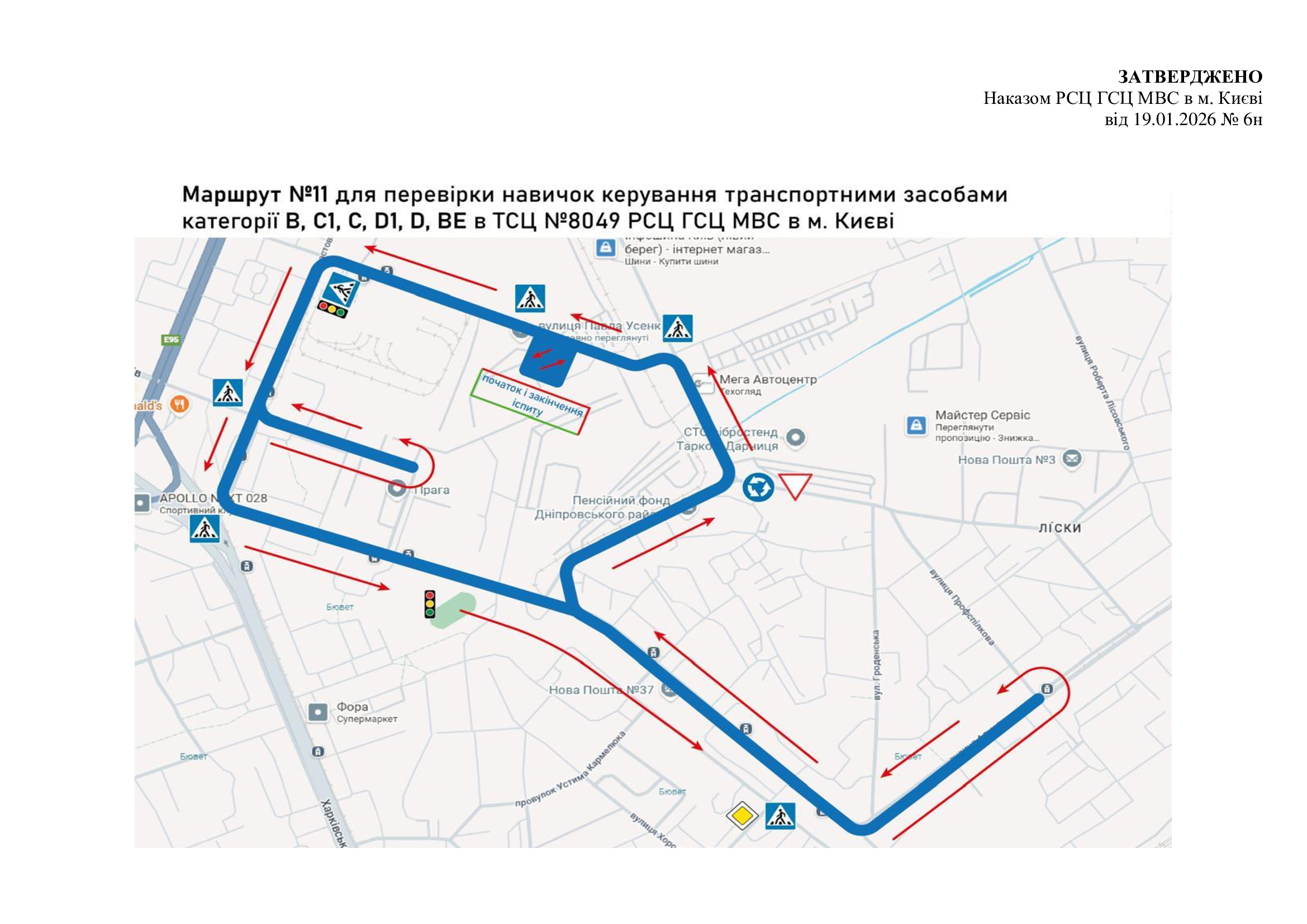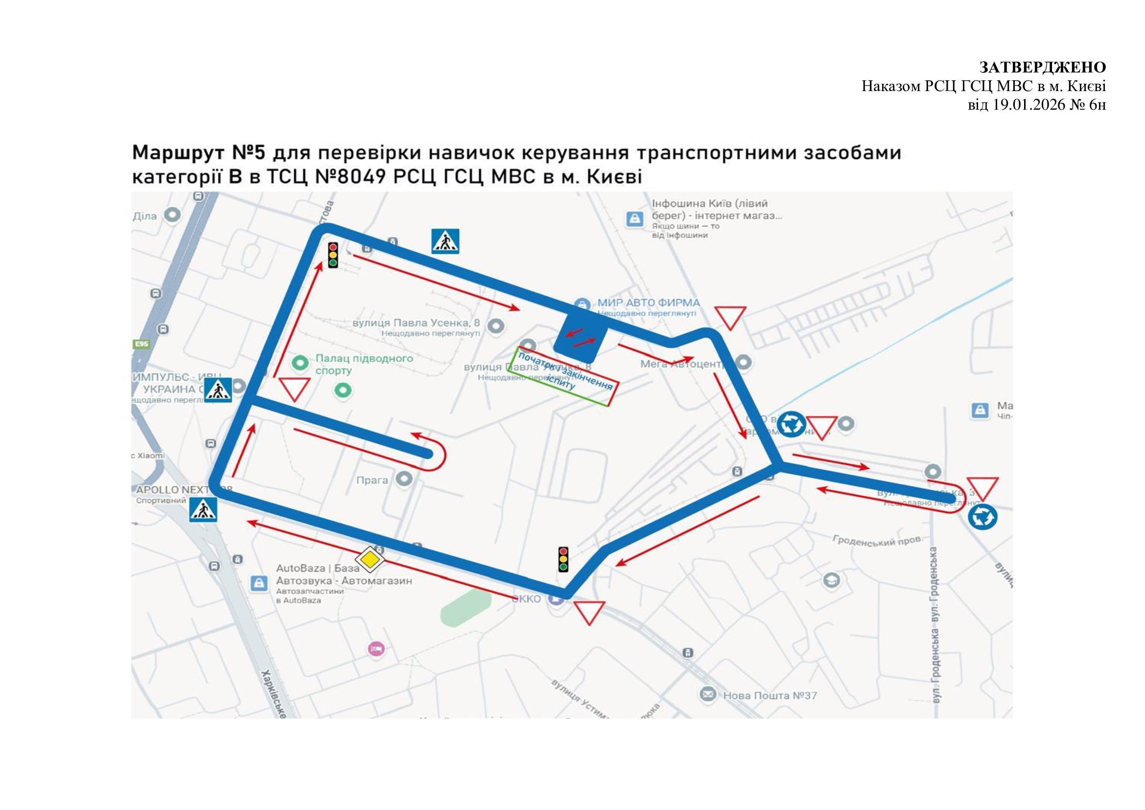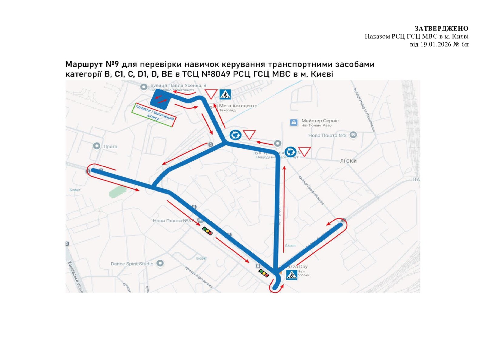 Маршрути для перевірки навичок керування транспортними засобами. м. Київ, вул. Павла Усенка, 8 (ТСЦ МВС № 8049)