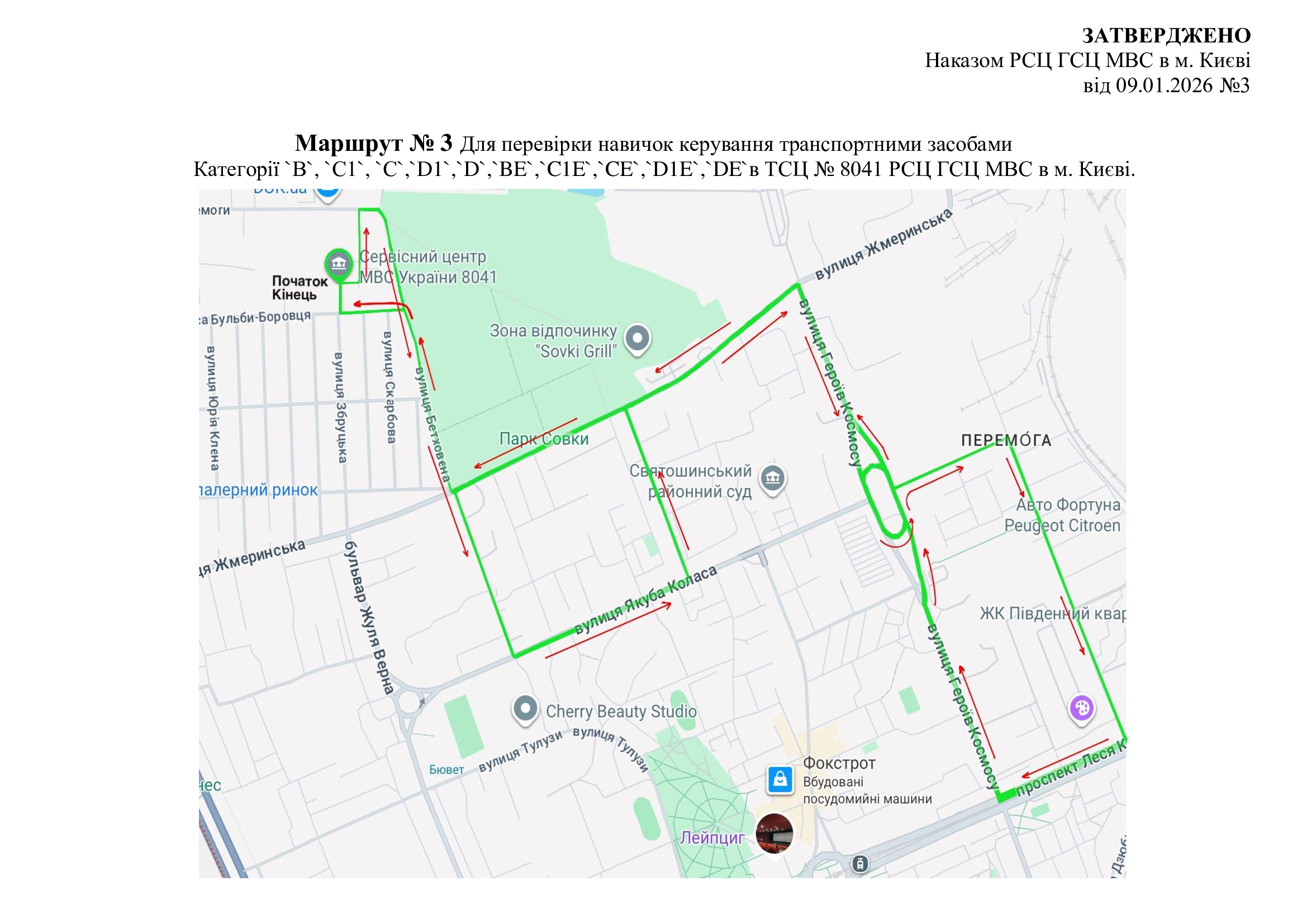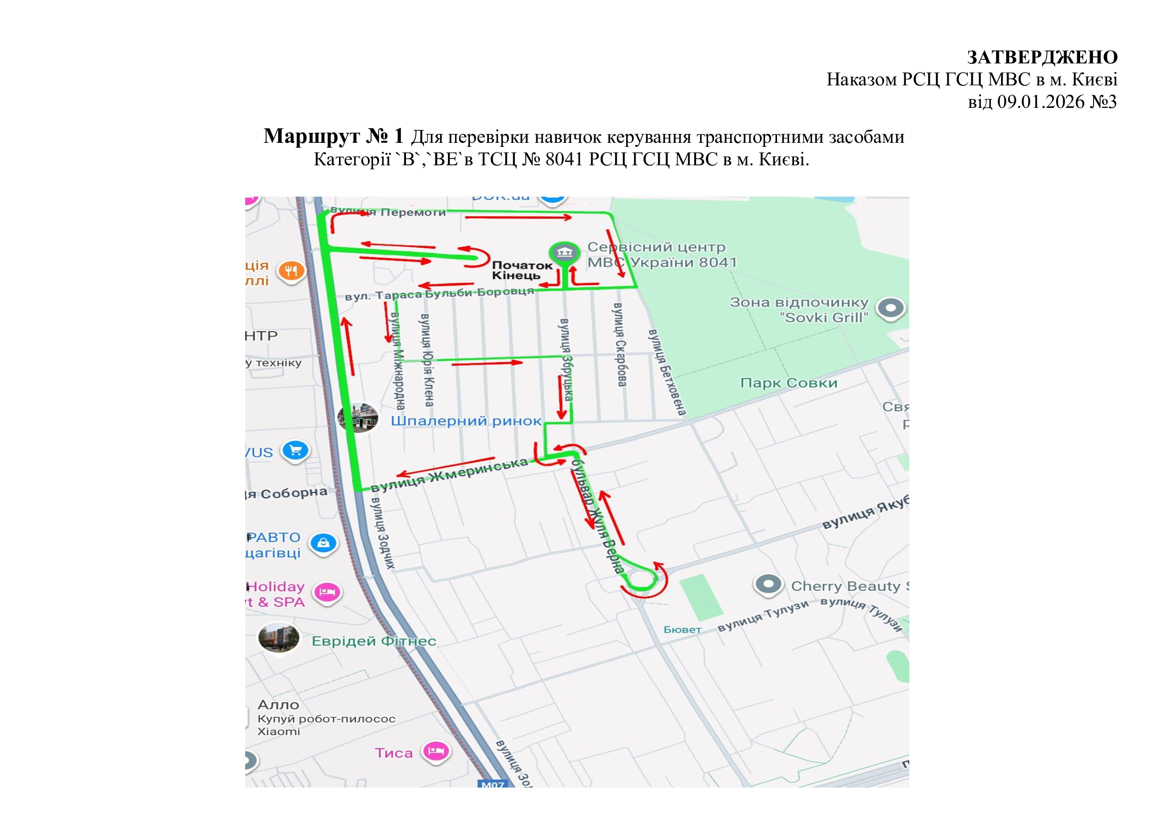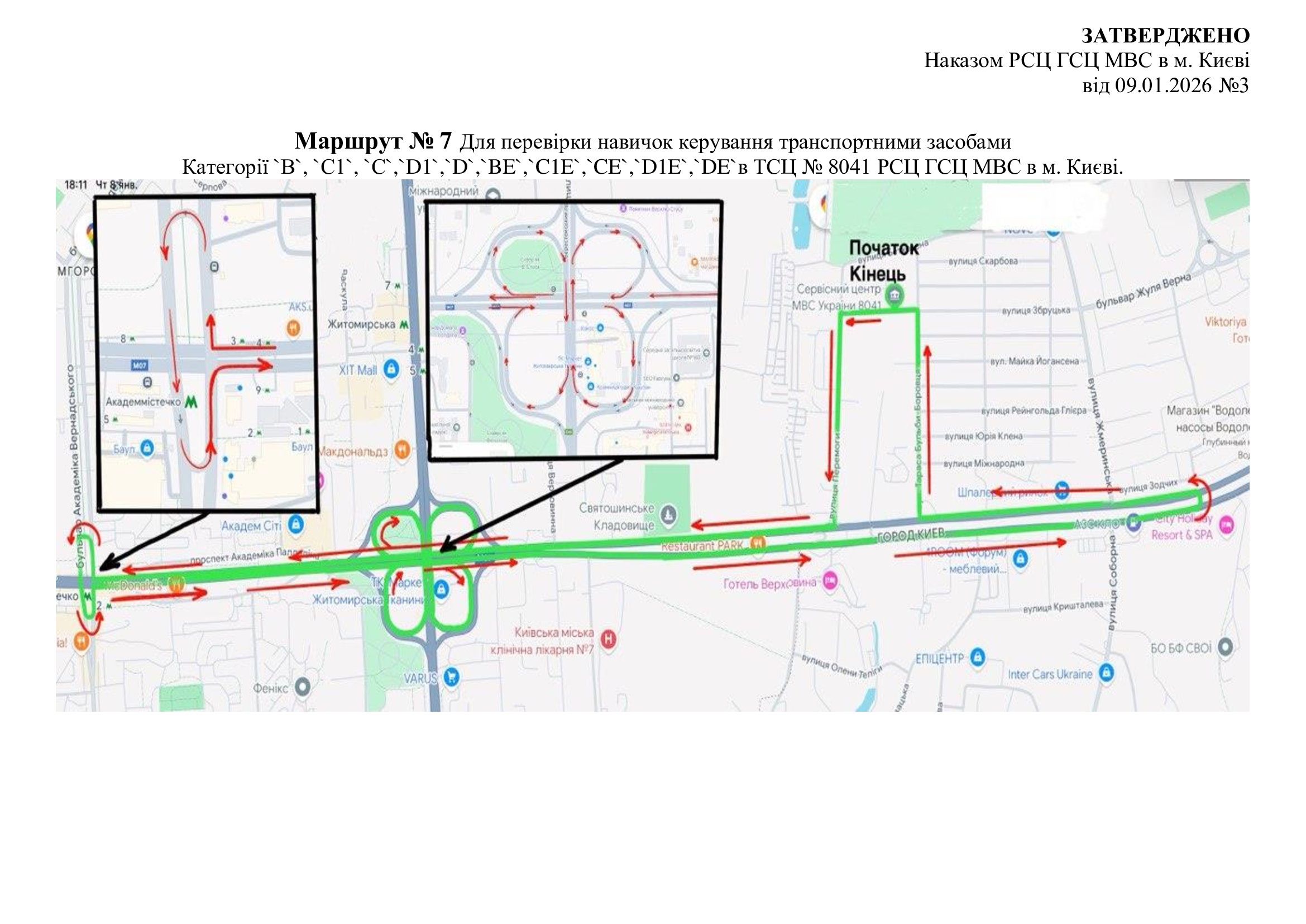 Маршрути для перевірки навичок керування транспортними засобами. м. Київ, вул. Перемоги, 20 (ТСЦ МВС № 8041)