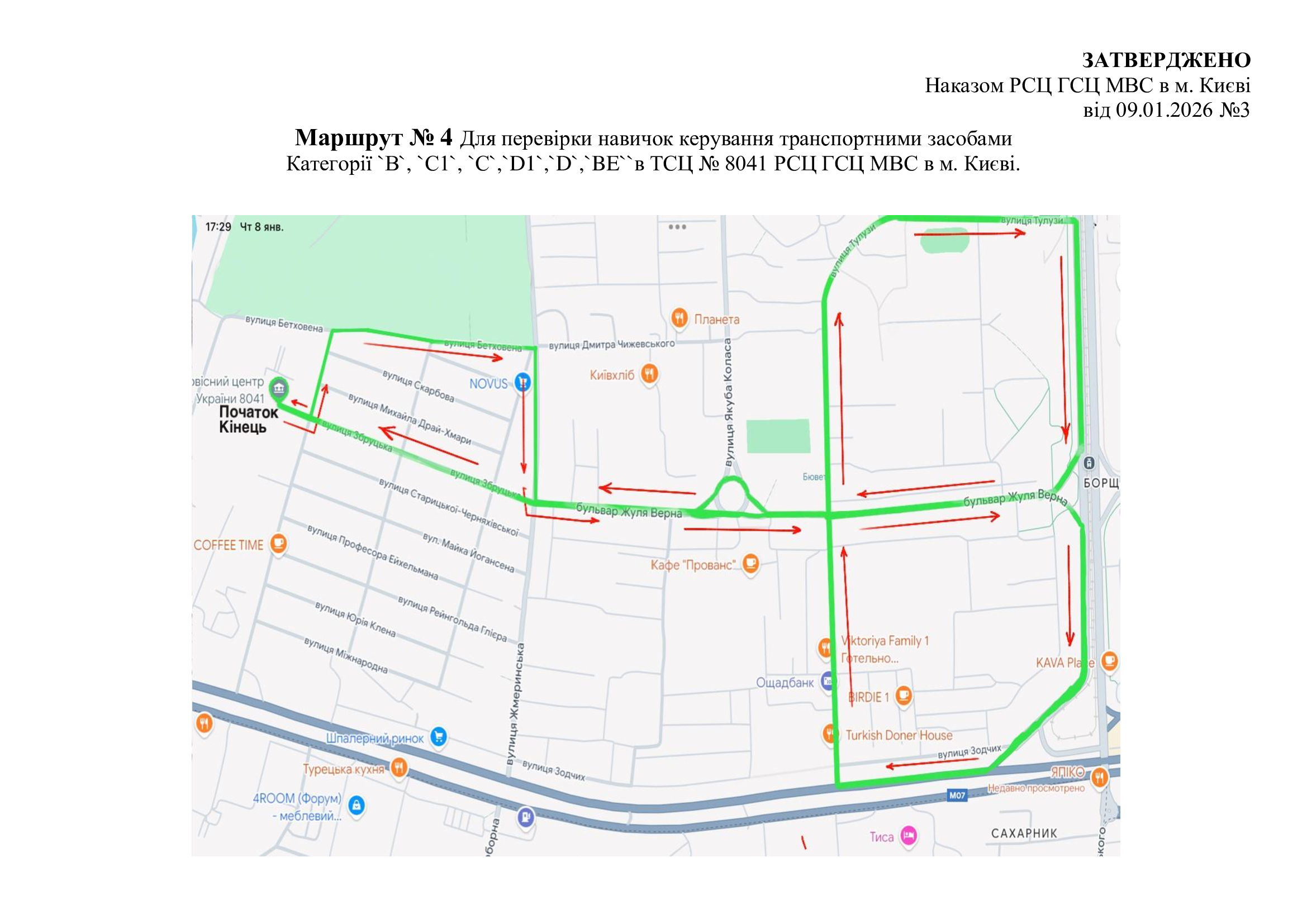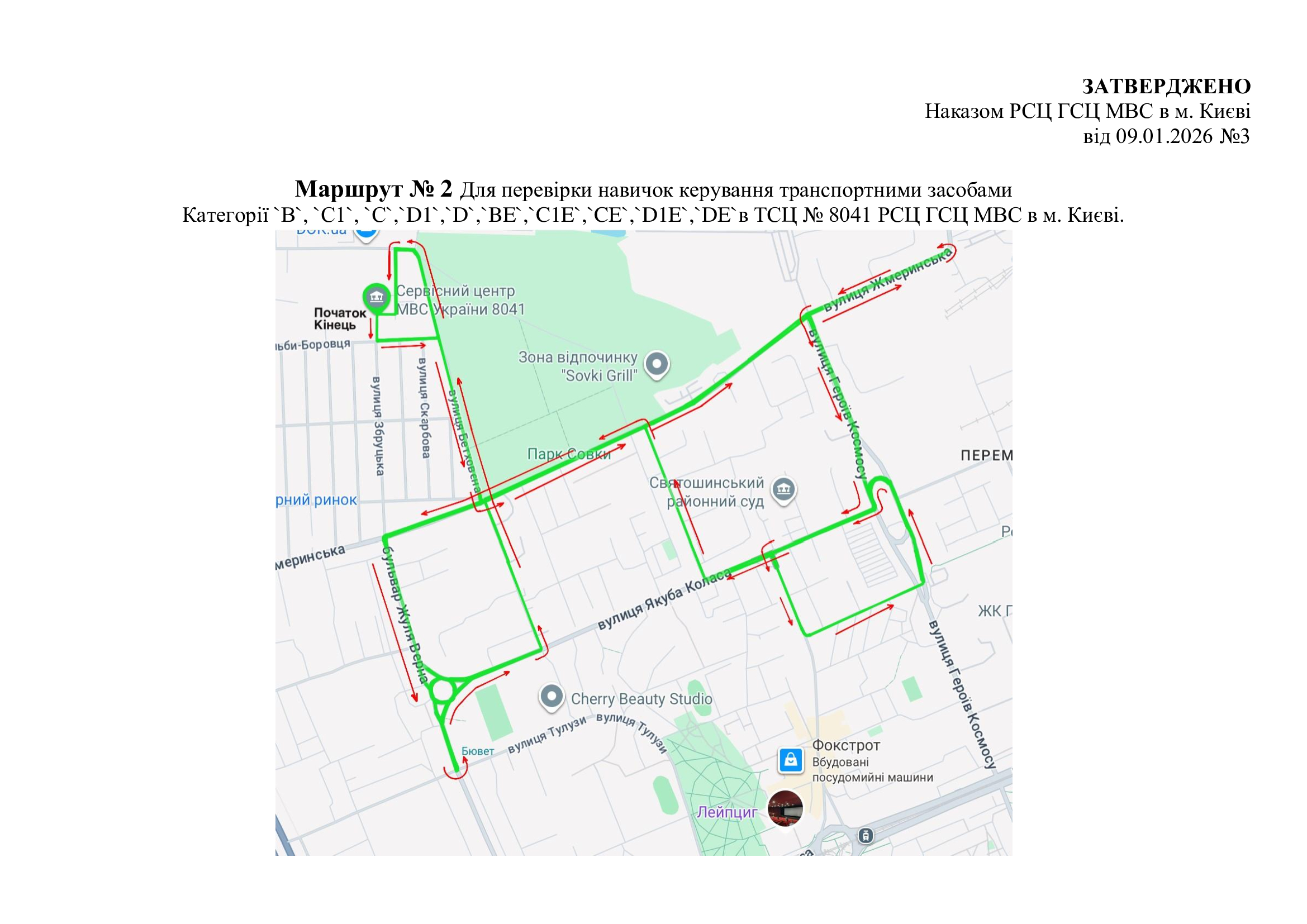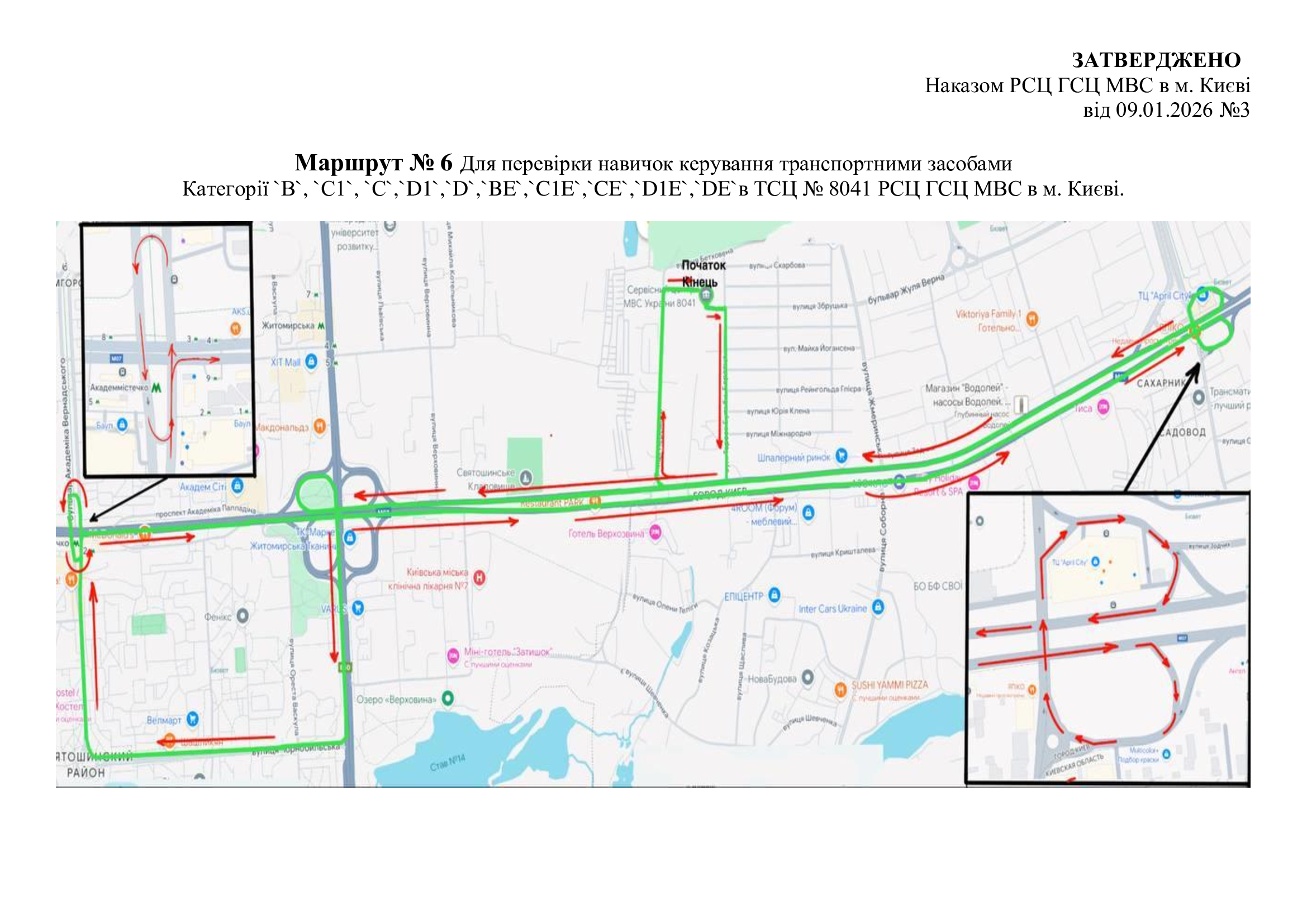 Маршрути для перевірки навичок керування транспортними засобами. м. Київ, вул. Перемоги, 20 (ТСЦ МВС № 8041)